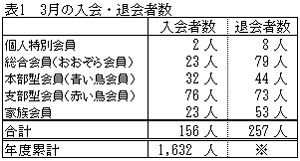 4月1日会員数36,978人(対前月-72)会員数は先月に比べ72人減少しました。3月の入会・退会者数の表をみますと、入会者数は退会者数より101人少なくなっています。会員の増減は入会者数と退会者数のほかに、会費切れ退会となった後に会費が支払われ会員として復活した人数によって決まります。3月の入会者数は156人で、前年同月の入会者217人に比べ61減少しました。また、3月の退会者は257人で、前年同月の退会者244人に比べ13人増加しました。