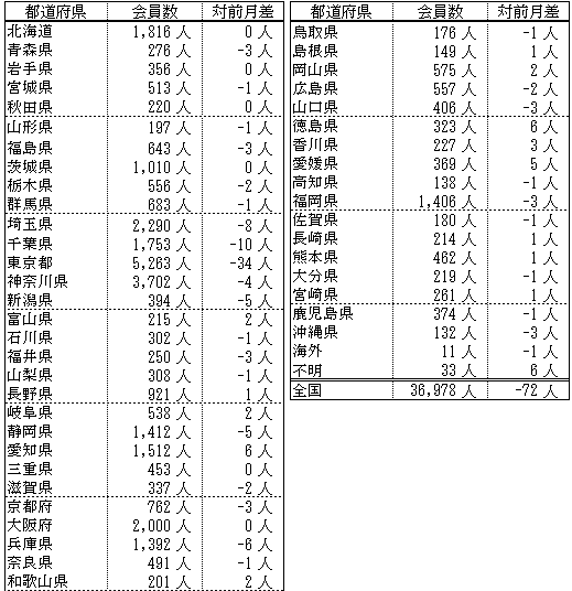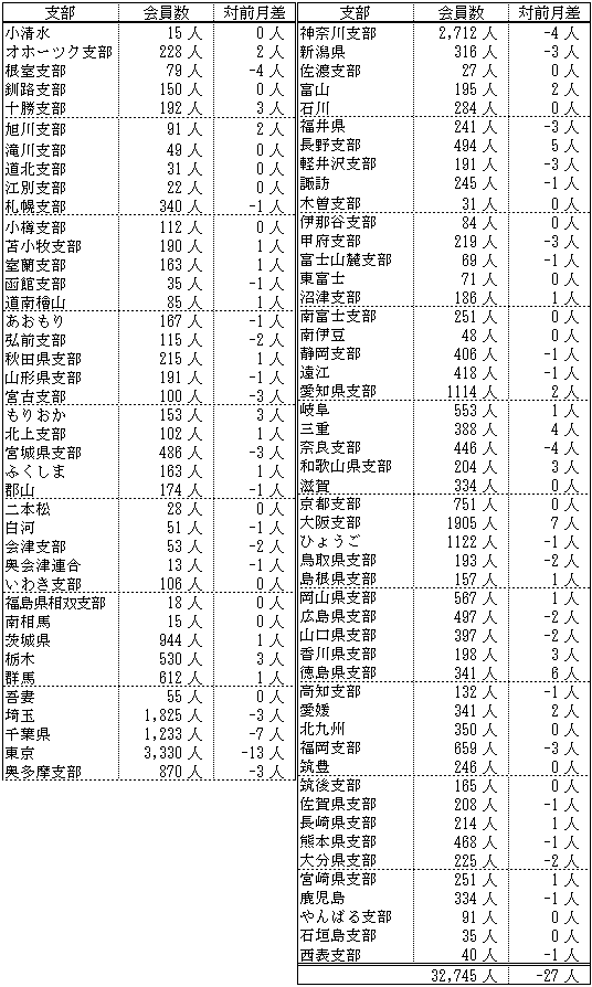 備考:支部別の会員数の合計は、都道府県別の会員数の合計と異なります。