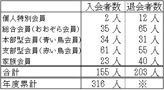 ※※会費切れ退会となった後に会費が支払われ会員として復活する方がいらっしゃるため、退会者数の年度累計は、実際の退会者数とずれた数字となります。このため、退会者数合計については年度末の集計後にお知らせいたします。