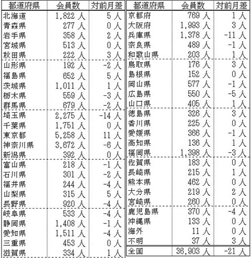 備考:不明は転居先が不明の会員を示します。今月からは転居先不明の会員も会員数に含めています。