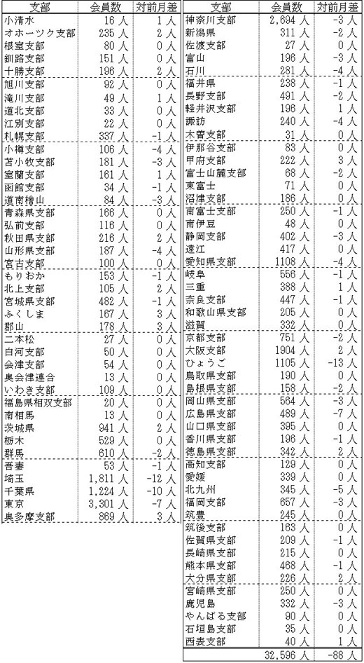 備考:支部別の会員数の合計は、都道府県別の会員数の合計と異なります。