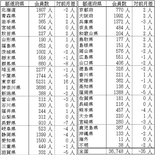 備考:支部別の会員数の合計は、都道府県別の会員数の合計と異なります。