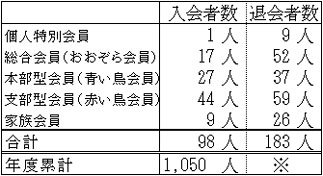 ※会費切れ退会となった後に会費が支払われ会員として復活する方がいらっしゃるため、退会者数の年度累計は、実際の退会者数とずれた数字となります。このため、退会者数合計については年度末の集計後にお知らせいたします。