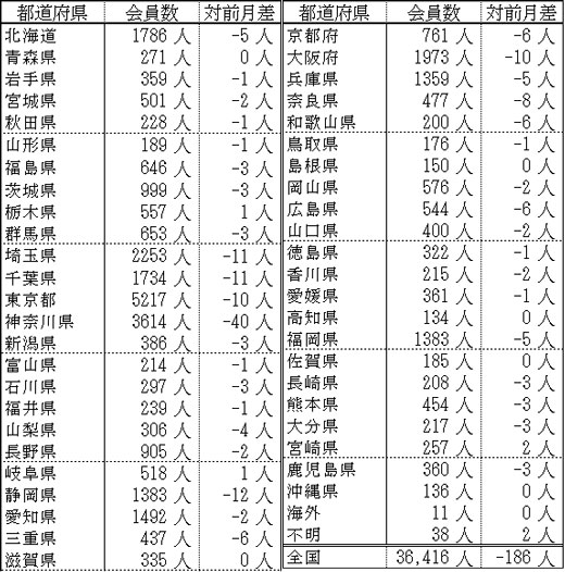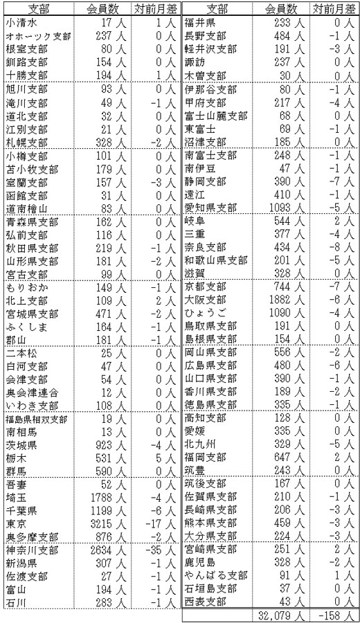 備考:支部別の会員数の合計は、都道府県別の会員数の合計と異なります。