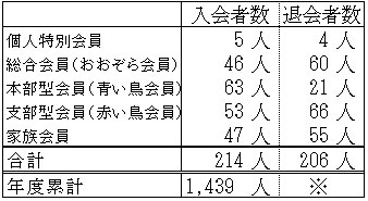 ※会費切れ退会となった後に会費が支払われ会員として復活する方がいらっしゃるため、退会者数の年度累計は、実際の退会者数とずれた数字となります。このため、退会者数合計については年度末の集計後にお知らせいたします。