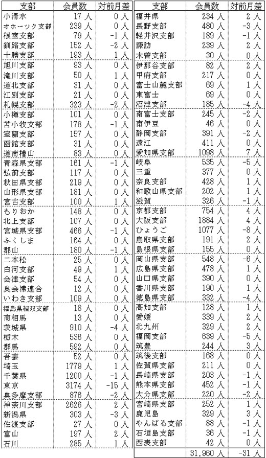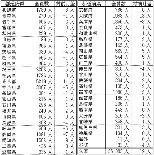 備考:支部別の会員数の合計は、都道府県別の会員数の合計と異なります。