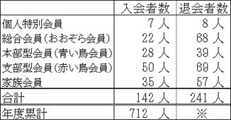 8月1日会員数36,208人(対前月-102)会員数は先月に比べ102人減少しました。7月の入会・退会者数の表をみますと、入会者数は退会者数より99人少なくなっています。会員の増減は入会者数と退会者数のほかに、会費切れ退会となった後に会費が支払われ会員として復活した人数によって決まります。7月の入会者数は142人で、前年同月の入会者122人に比べ20人増加しました。また、7月の退会者は241人で、前年同月の退会者250に比べ9人減少しました。