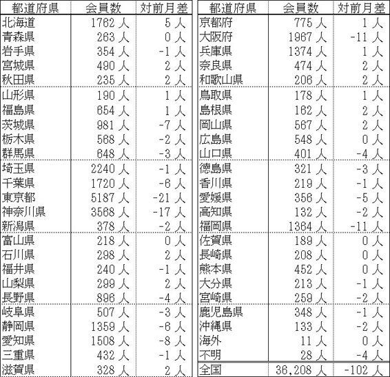 備考:支部別の会員数の合計は、都道府県別の会員数の合計と異なります。これは、本部型(青い鳥)会員や支部に所属されていない個人特別会員が支部別の会員数に含まれないためです。