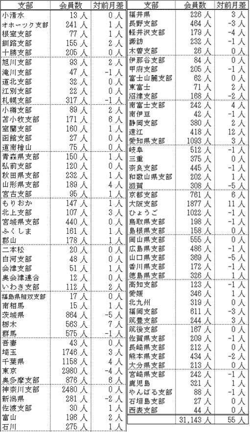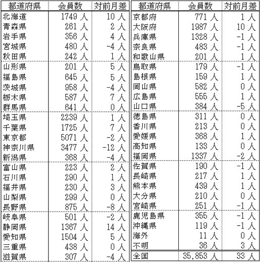 備考:支部別の会員数の合計は、都道府県別の会員数の合計と異なります。