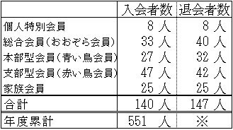 ※会費切れ退会となった後に会費が支払われ会員として復活する方がいらっしゃるため、退会者数の年度累計は、実際の退会者数とずれた数字となります。このため、退会者数合計については年度末の集計後にお知らせいたします。