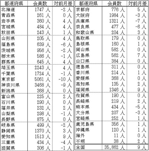 備考:支部別の会員数の合計は、都道府県別の会員数の合計と異なります。